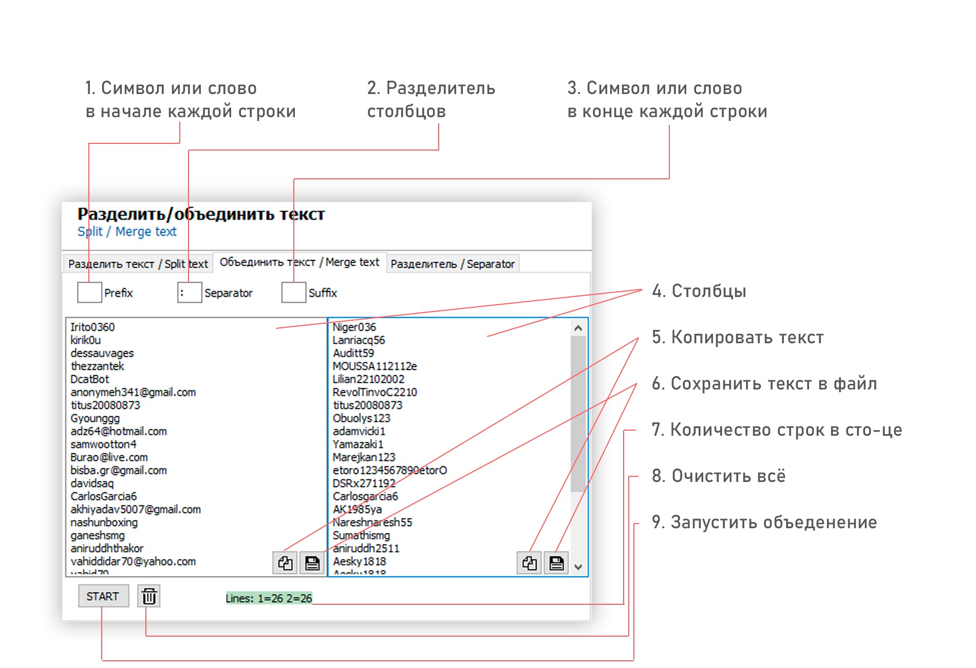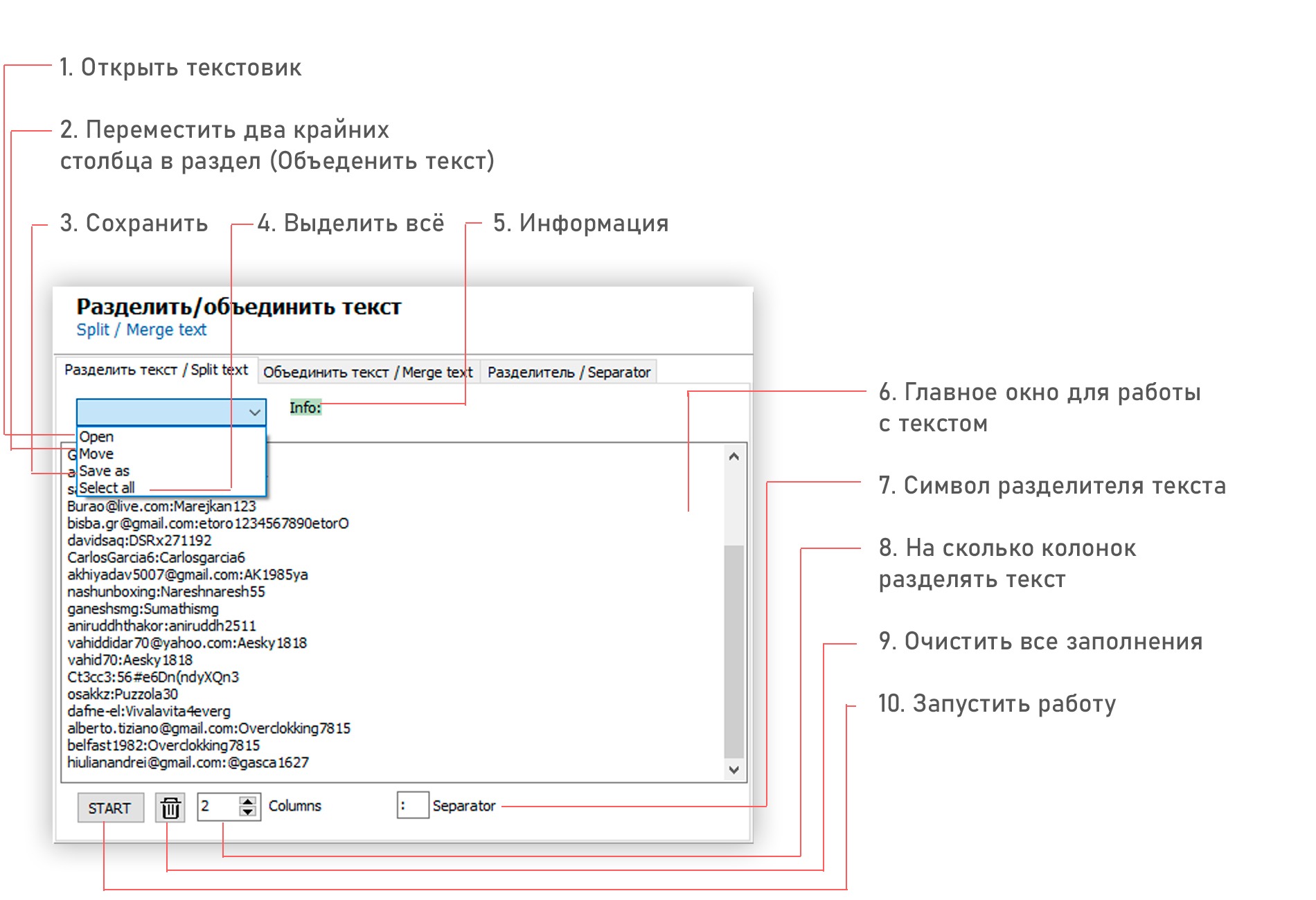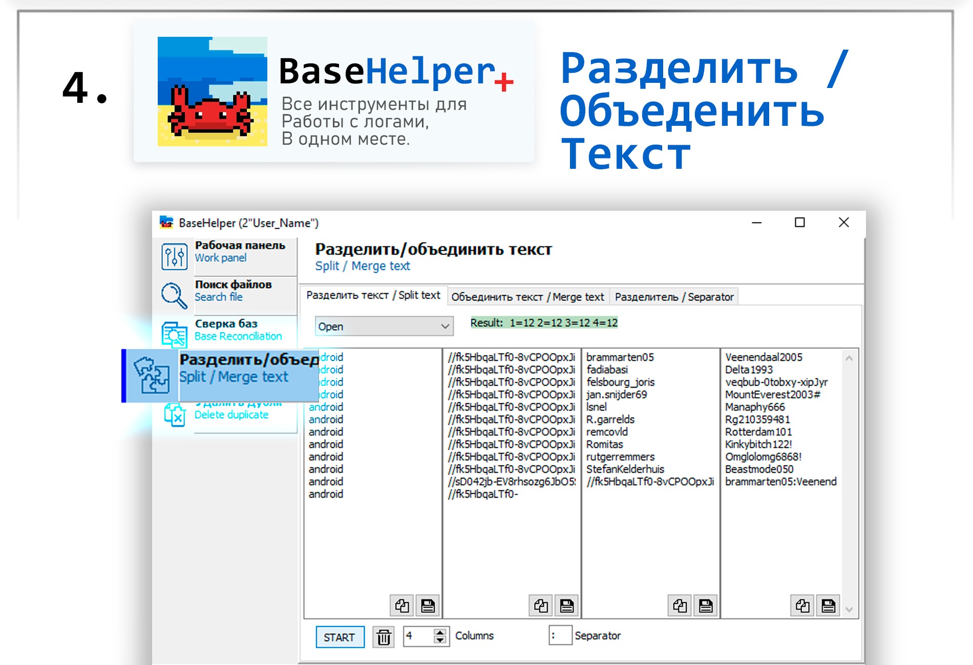 BH+: Разделить/Объеденить текстОписание инструментовНАЗАД НА ГЛАВНУЮРазделить текстОбъеденить текстРазделитель1 [ Разделить текст ]2 [ Объеденить текст ]3 [ Разделитель ]