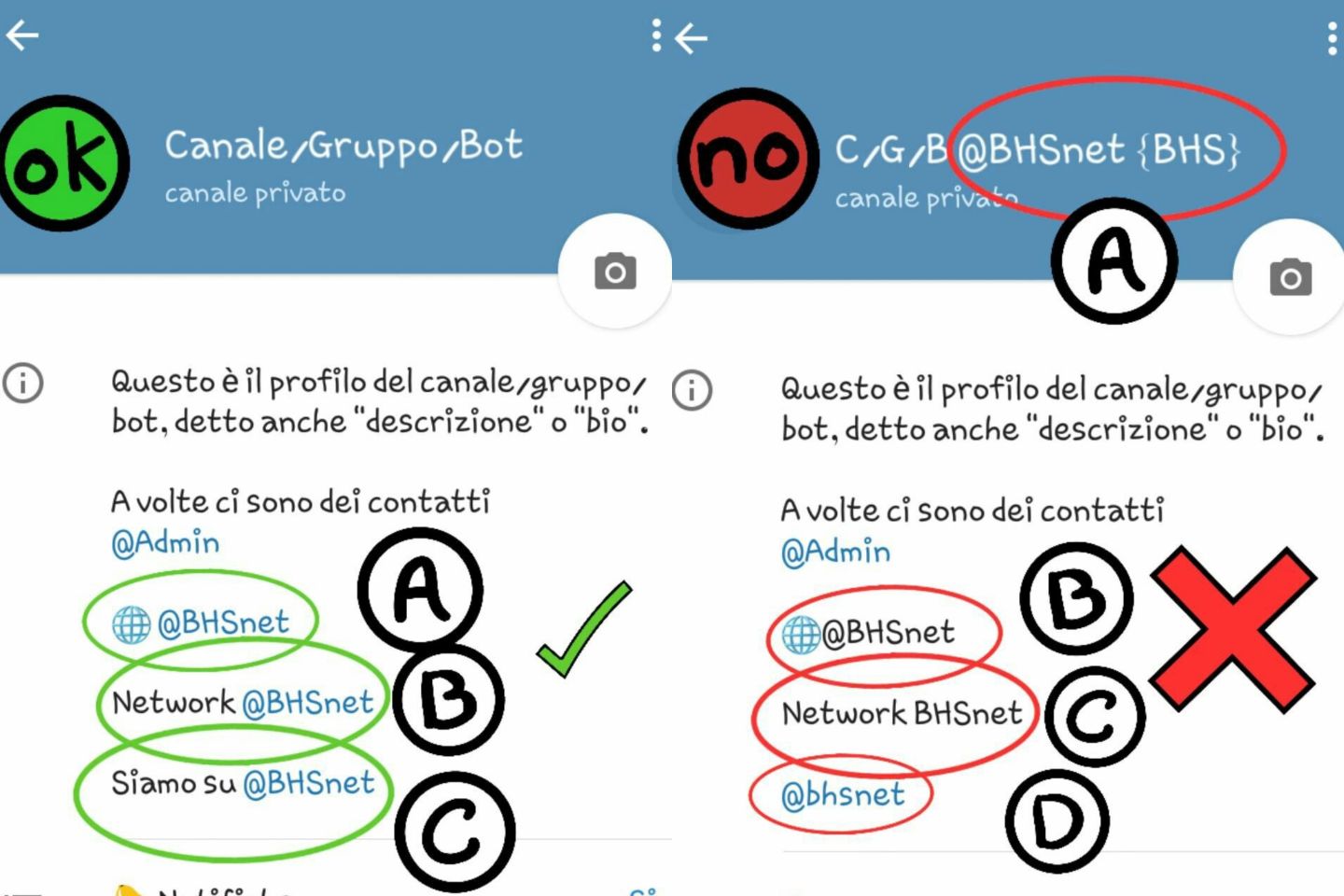 - Aver messo @BHSnet in descrizione. Vedi esempi.