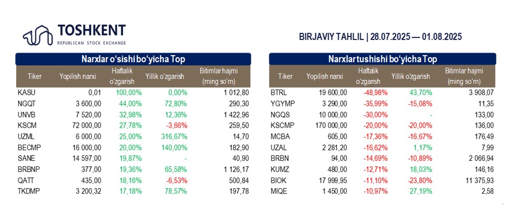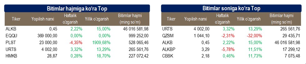 Birjaviy bitimlarning barcha maydonchalardagi umumiy soni — 5 302 (-3,93% avvalgi haftaga nisbatan)