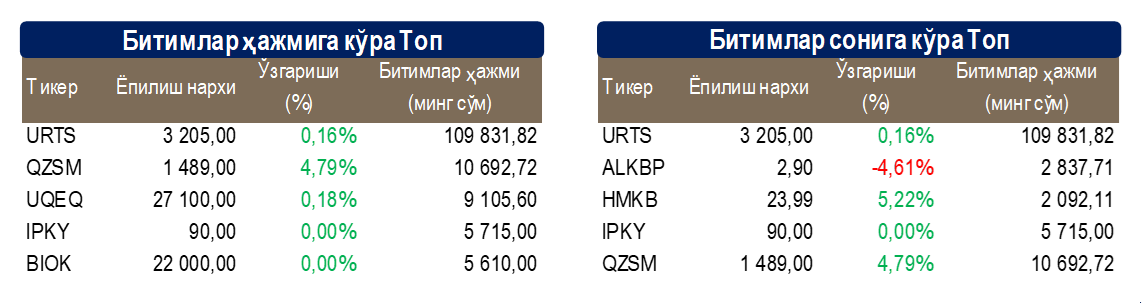 Савдо қилинган қимматли қоғозлар сони бўйича Топ 5: