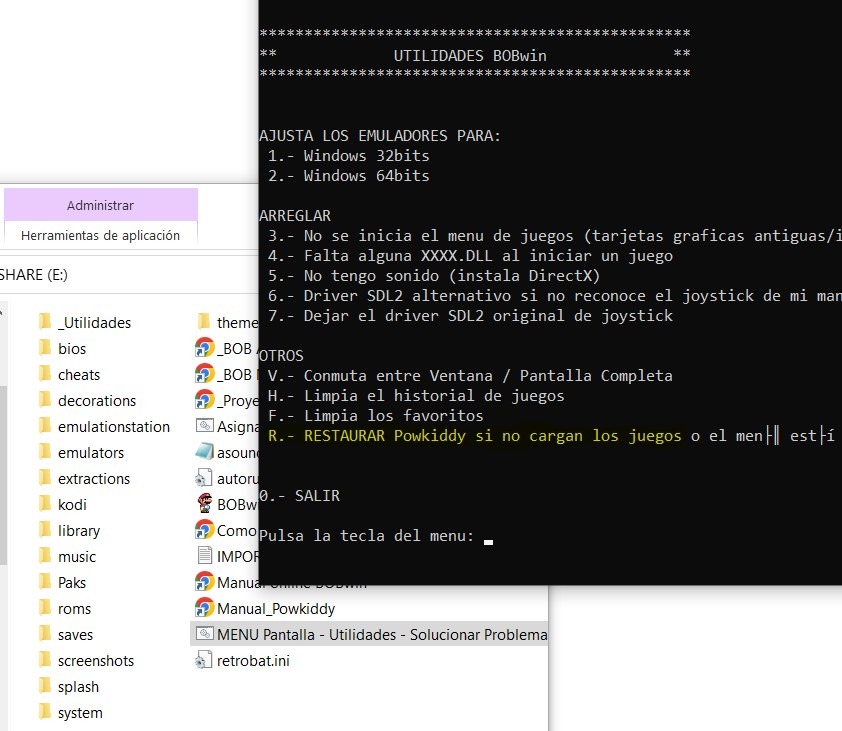 ● BOBwin (Retrobat) disponible en la MicroSD. Aprovechando que la partición SHARE es visible en Win10/11 juega con el mismo menú y juegos en Windows sin instalar nada. Scrapea y añade juegos rápida y cómodamente desde el ordenador si no tienes wifi/red en la Powkiddy.
