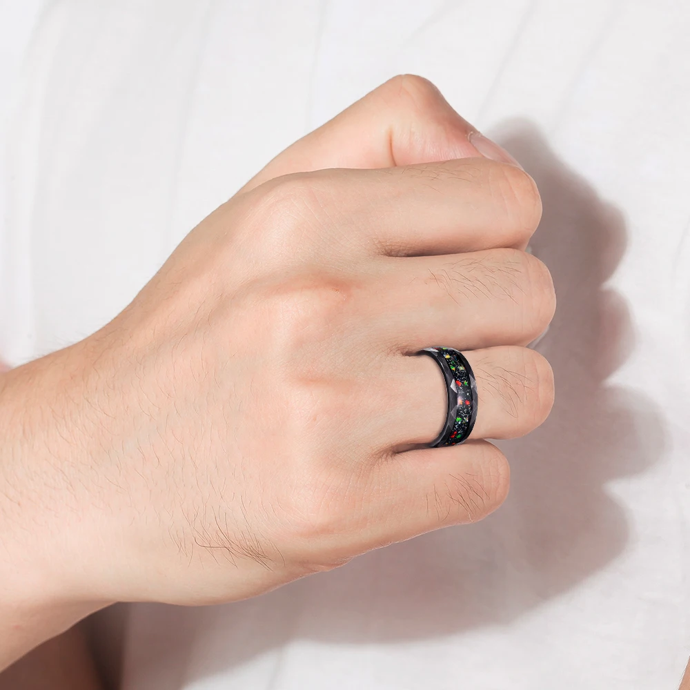 «BONLAVIE 8mm Hammer Pattern Set Black Sand Bottom Fire Color and Blue Broken Opal Electric Black Tungsten Steel Ring Size 7-12» по лучшей цене на рынке! Всего за 14$ (1330рублей)