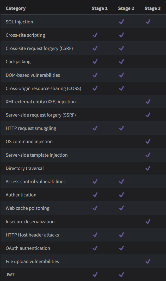 - Поиск документации и лабораторных работ PortSwigger. Многие вещи возможно будут подходить напрямую из решений лабораторных работ, но могут встретиться темы которые не поднимались во время изучения уязвимостей на сайте.