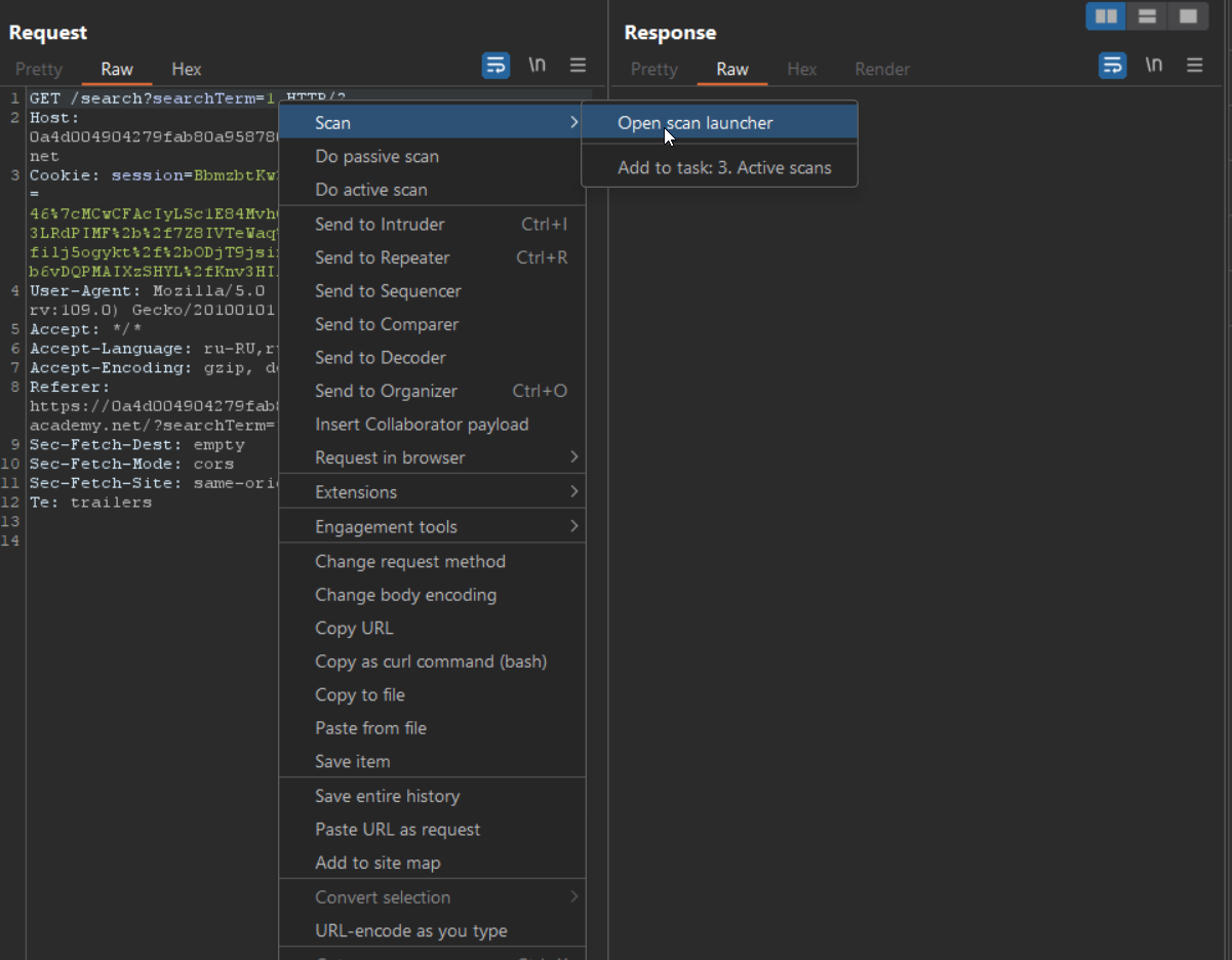 Отправляю в ActiveScan для обнаружения потенциальной уязвимости, и он помечает DOM-XSS.