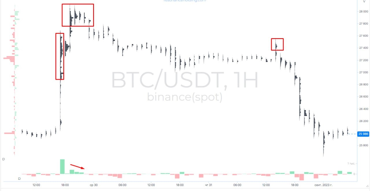 По кластерам выделяем разовый крупный объём покупателя, а затем уменьшение объёма от покупателя. Образование лимитного давления продавца. Перед проливом были попытки покупателя всё же двинуть цену вверх (2 красных прямоугольника), но покупки быстро упёрлись в лимиты продавцов и быстро вернулись к значениям ниже предыдущих, а там уже смещение давления и дальнейший пролив.
