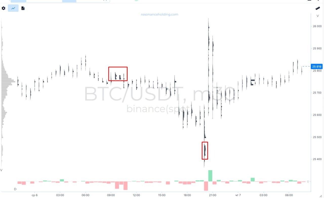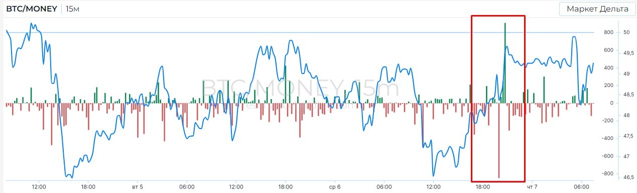 По кластерам, вчера было замечено давление продавца, но на пике продаж был замечен хороший спрос, продали и приняли внизу около 600 BTC, от этой плотности цена и подскочила.