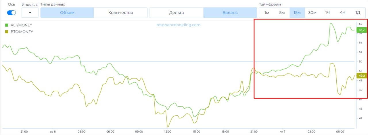 По индексам заметил расхождение, спрос на альту растёт больше, чем на BTC.