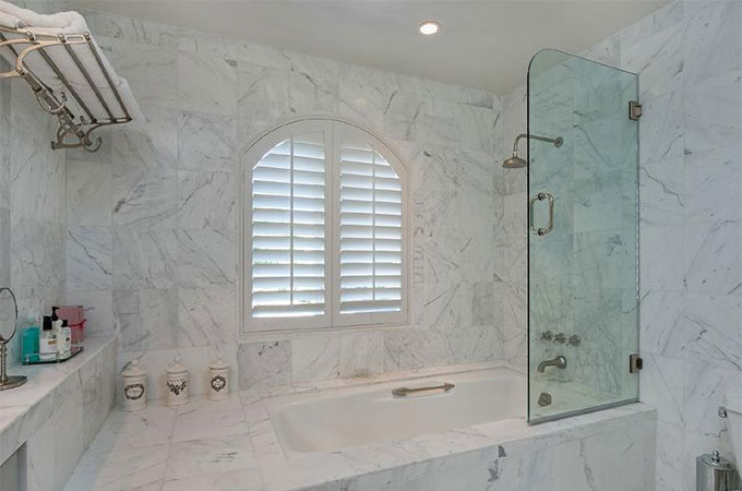 Перевести · view full size. An arched doorway leads to a wash closet beautifully fitted with marble basket weave floor tiles, white wainscoted walls, and a seamless glass enclosed walk-in shower …