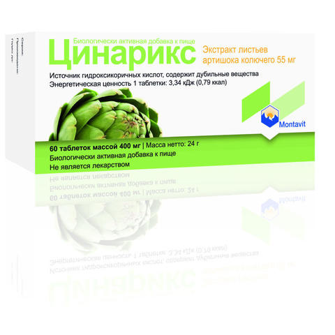 Цинарикс - биологически активная добавка к пище (БАД), источник гидроксикоричных кислот . Содержит дубильные вещества . Форма выпуска и состав Форма выпуска - таблетки массой 400 мг . Состав каждой таблетки: экстракт листьев артишока колючего, целлактоза, кросповидон, коповидон, мальтодекстрин, кремния диоксид, тальк, магния стеарат, оболочка .