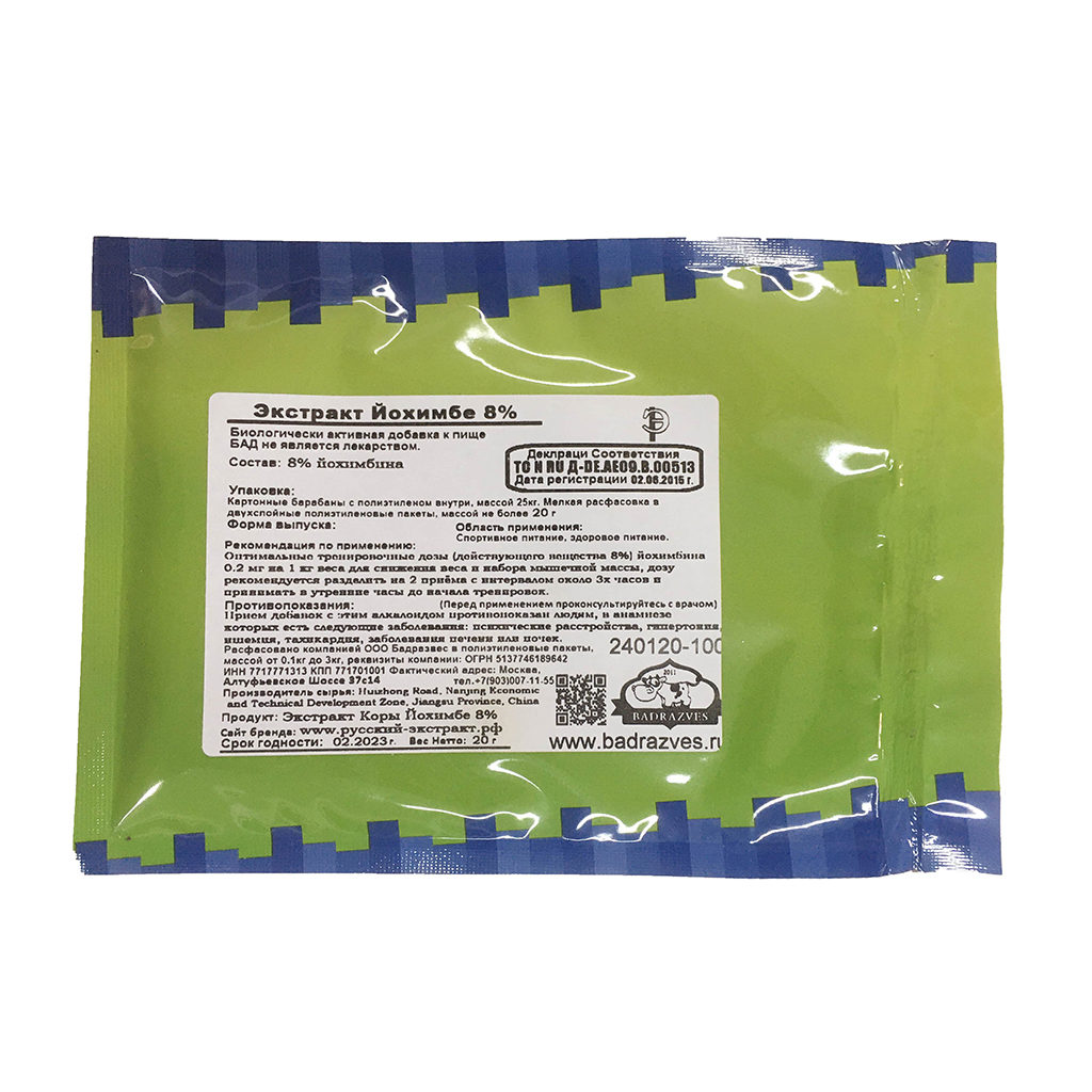 При использовании БАДов, содержащих в качестве активного компонента экстракт йохимбе, в сутки можно принять максимум 2000 мг (2 г) . А при применении БАДов с йохимбина гидрохлоридом максимально допустимая суточная доза составляет 30 мг . Разовая доза йохимбина гидрохлорида составляет 5 мг, а экстракта коры йохимбе - до 1000 мг .