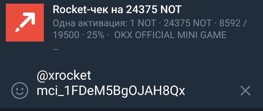 Найдите ссылку на чек xRocket. Уберите от ссылки https://t.me/xrocket?start=, должно остаться что то похожее на mci_1FDeM5BgOJAH8Qx.