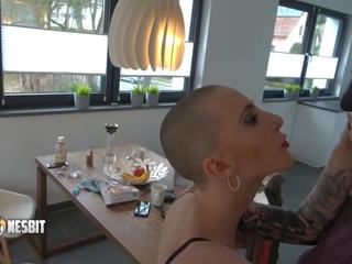 Bald tatted slut Saffron Azure with both holes available . . .