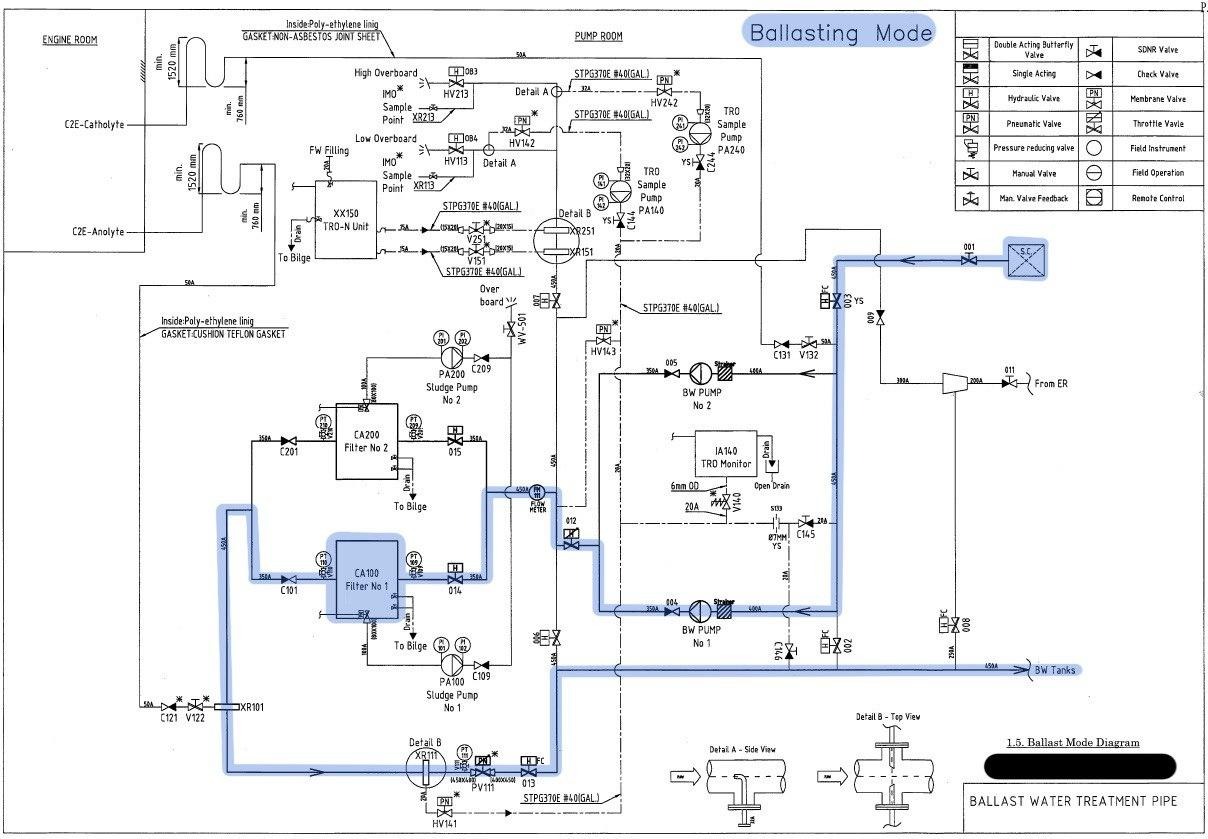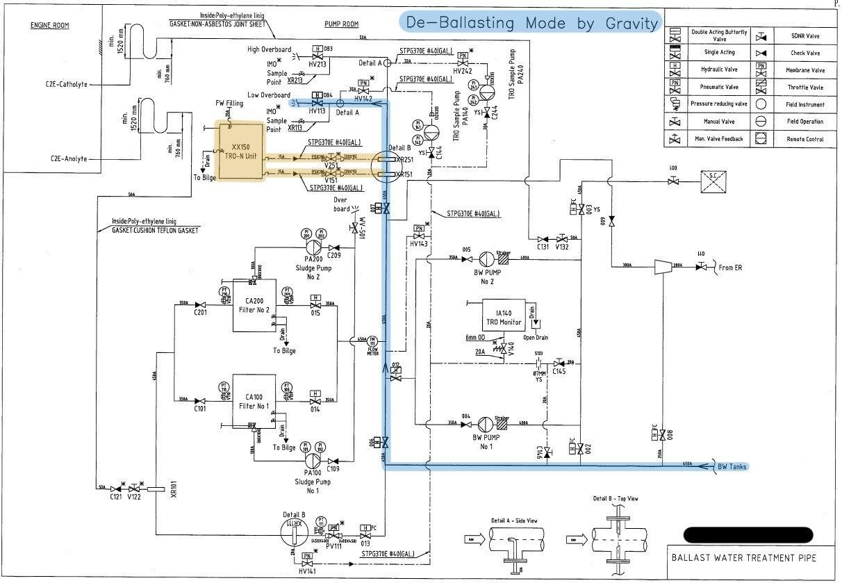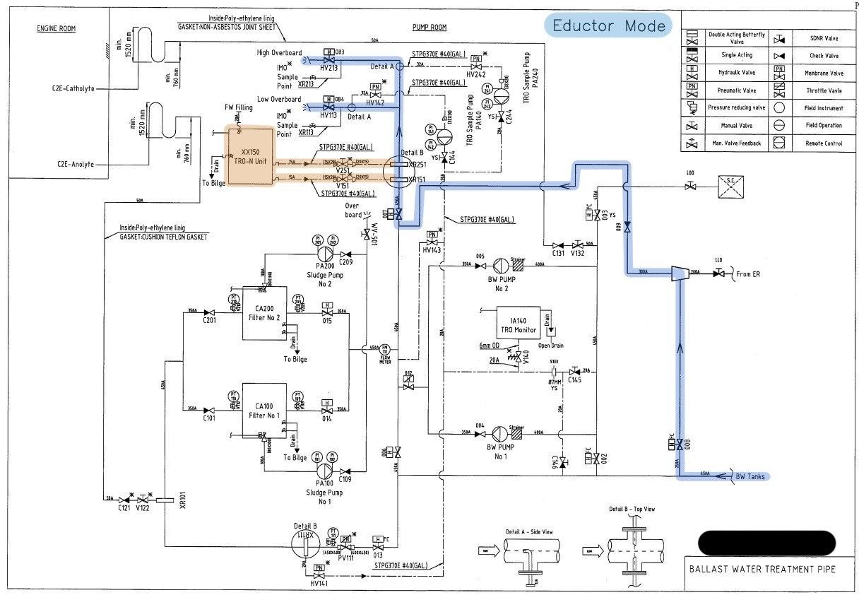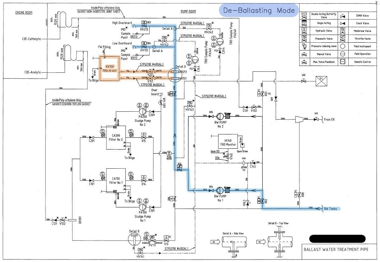 Если мы набирали воду с использованием этой системы, то в танках ничего живого не должно быть, поэтому отдается балласт без участия фильтров и C2E юнита. Но тут тоже не все просто. При отдаче система мониторит значение TRO (Total Residue Oxidants – остатки окислителя, вольный перевод) оно должно быть ниже 0.1ppm.