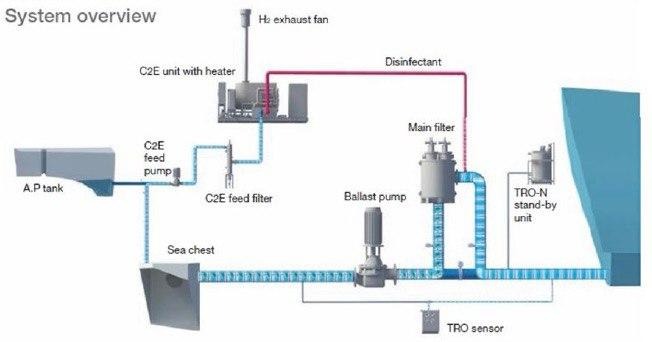 Дезинфекция происходит с помощью C2E Unit по технологии C2E электро-химической активации забортной воды методом электролиза – получается электролит. C2E производит концентрат (AWAC – Activated Water Acidic) и щелочь (AWAL – Activated Water Alkaline).