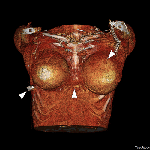 Реконструированные проекционные изображения демонстрируют выход пули из левого имплантата в заднюю часть правого имплантата. Также обнаружена пуля в правой грудной стенке. На основании клинической траектории входа пули и рентгенологической оценки единственным источником отклонения пули является левый грудной имплантат.