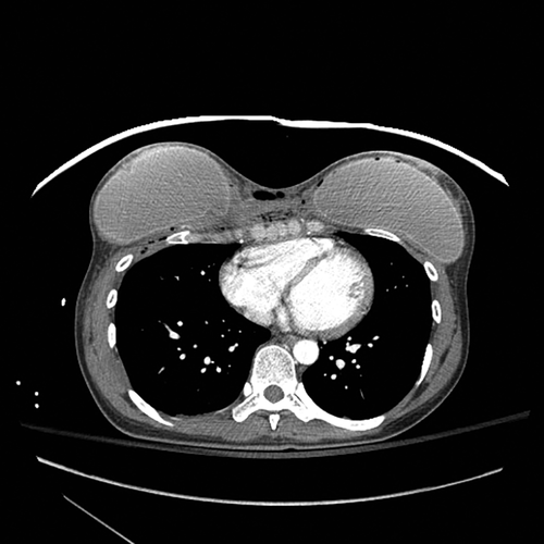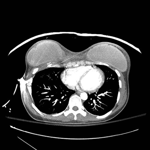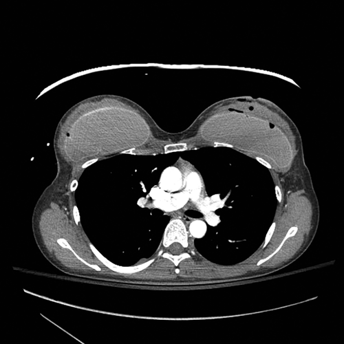 Figure 7. Аксиальная компьютерная томография (КТ) выявила входное отверстие в левой молочной железы с пулевым ходом в левом грудном имплантате, гематому и повреждение мягких тканей.