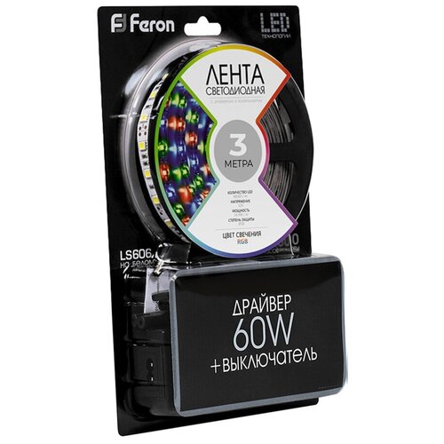 Bande LED 12V complète avec driver FERON LS606, 60*SMD5050, 14,4W/m, IP20, (RGB), complète avec connecteur femelle, contrôleur, interrupteur, driver 60W, rapport de coupe mm 50mm, 3000*10*2 .32mmBande LED 12V complète avec driver FERON LS606, 60*SMD5050, 14,4W/m, IP20, (RGB), complète avec connecteur femelle, contrôleur, interrupteur, driver 60W, rapport de coupe mm 50mm, 3000*10*2 .32mm