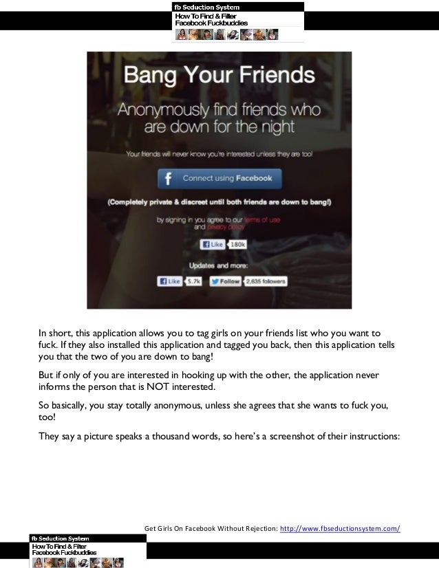 Bang with Friends is an Android application that allows you to mark those of your Facebook friends that you'd like to have sex with - and no one else can see . The app lets you send a private message to those users who have likewise marked you . . . and then it's up to you two to do the rest . The key in making this tool work is anonymity .