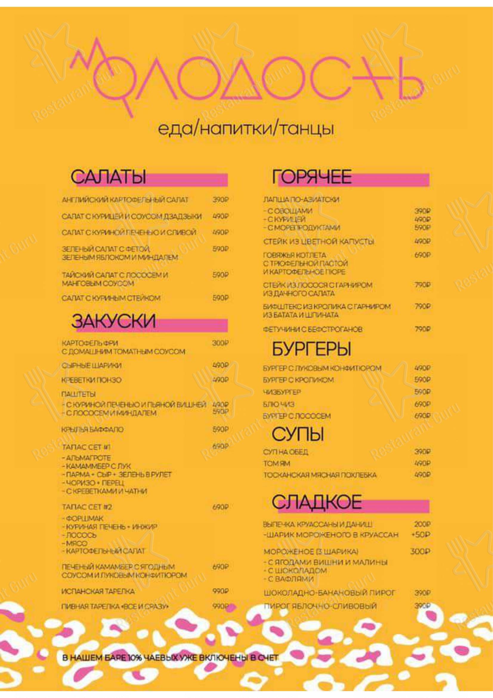 Бар юность меню