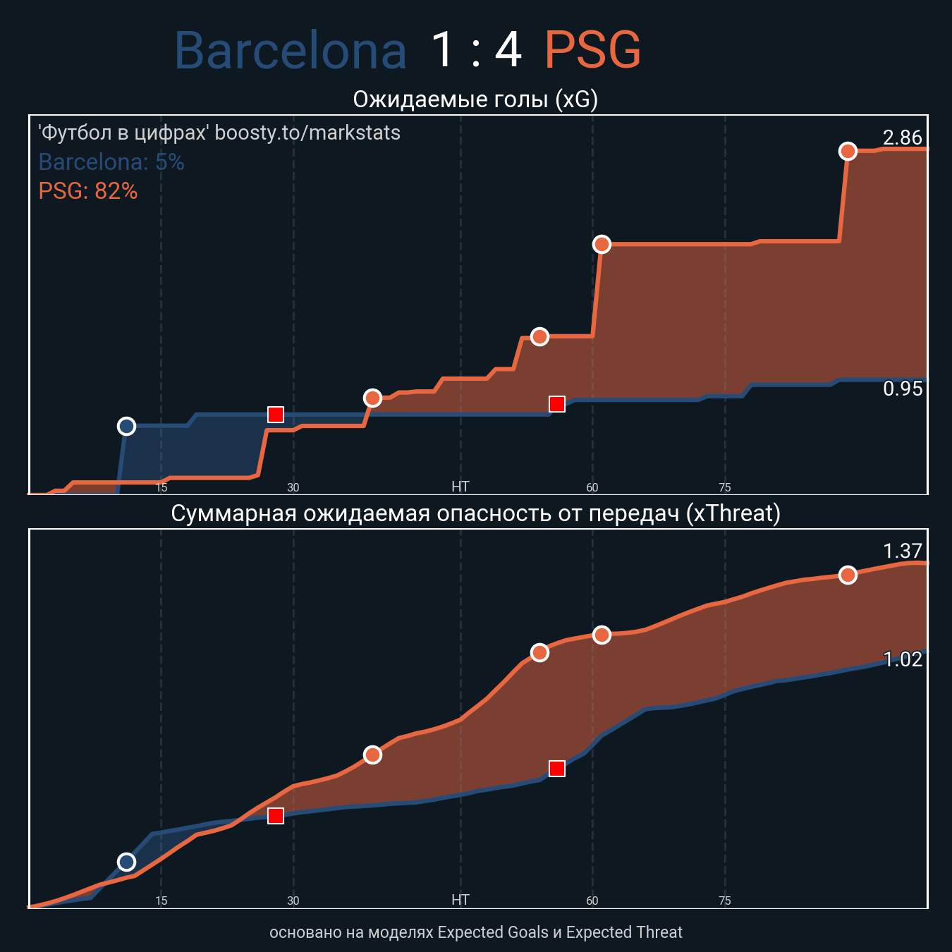 Ожидаемые голы (NPxG): 0.95 - 2.1