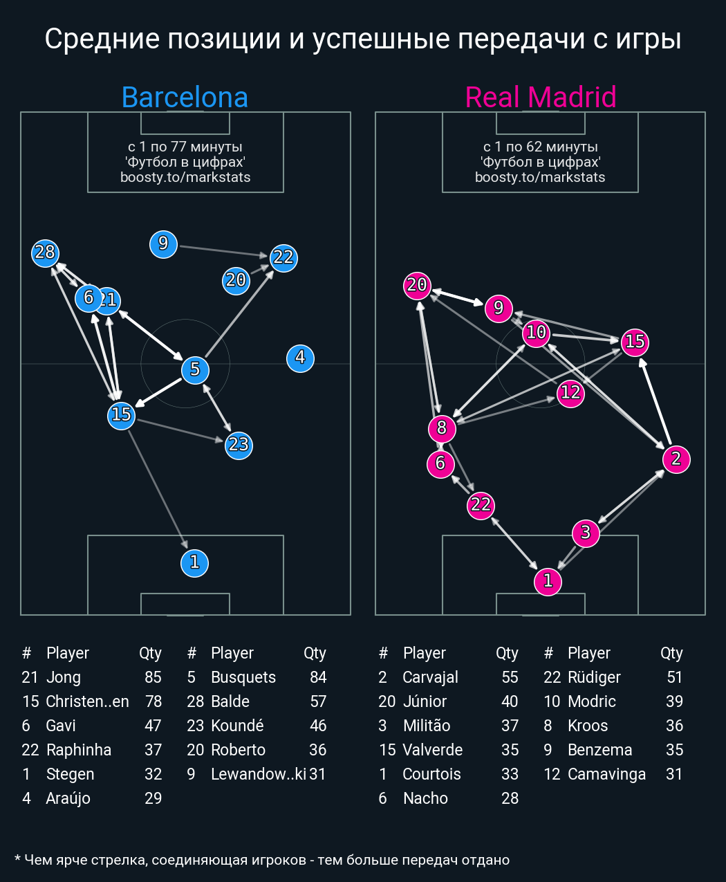 29 успешных передач из 40 попыток (2 под удар, 11 на трети соперника)