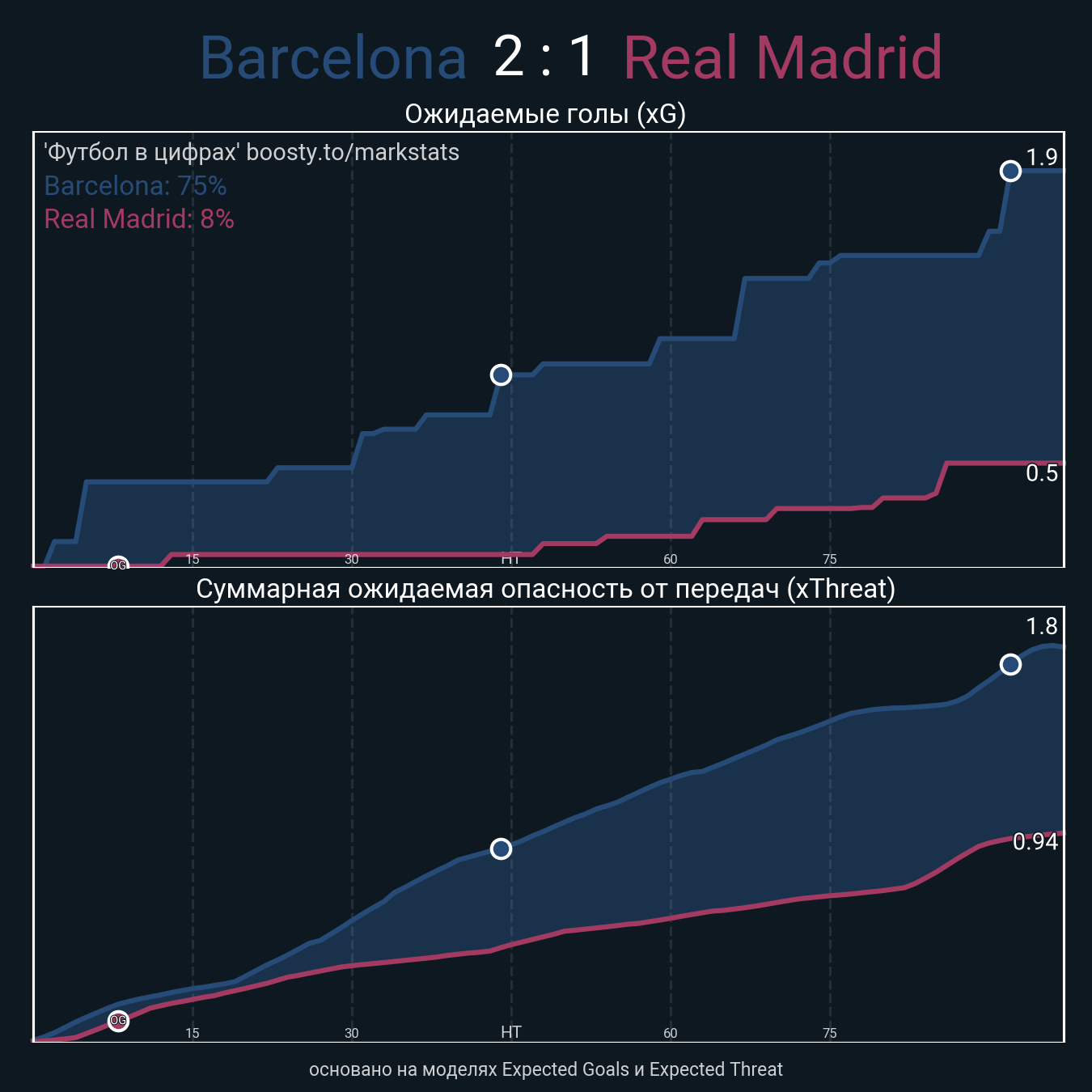Ожидаемые голы (NPxG): 1.9 - 0.5