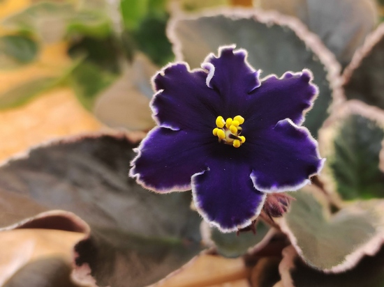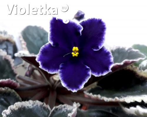 РС-Бархат Ночи . Артикул: Очень тёмные синие цветы с белой слегка волнистой каймой . Пестролистная розетка . Вид растения: некрупная детка крупная детка .