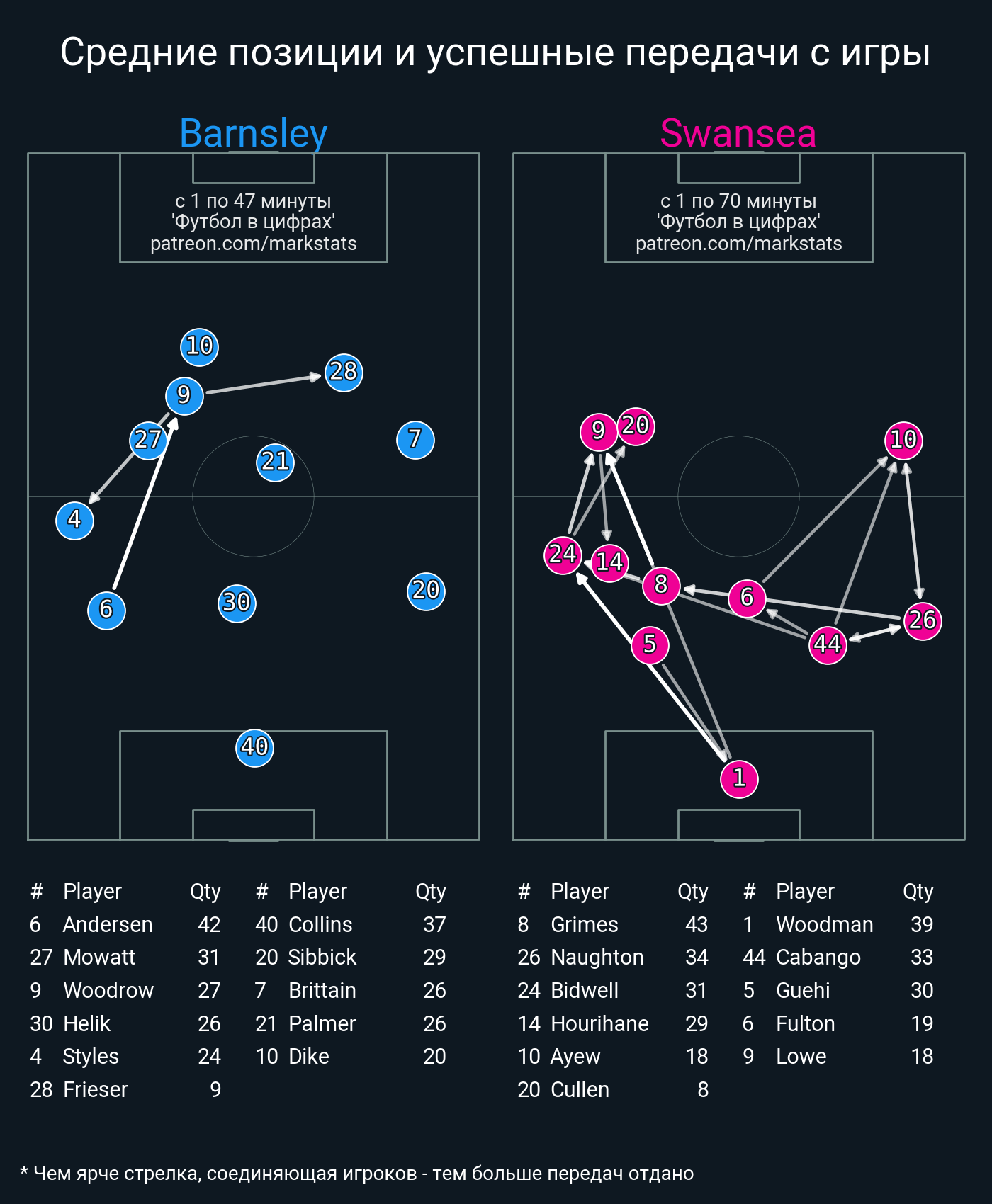 ▪ 20 успешных передач из 46 попыток (1 под удар, 6 с продвижением, 9 на трети соперника)