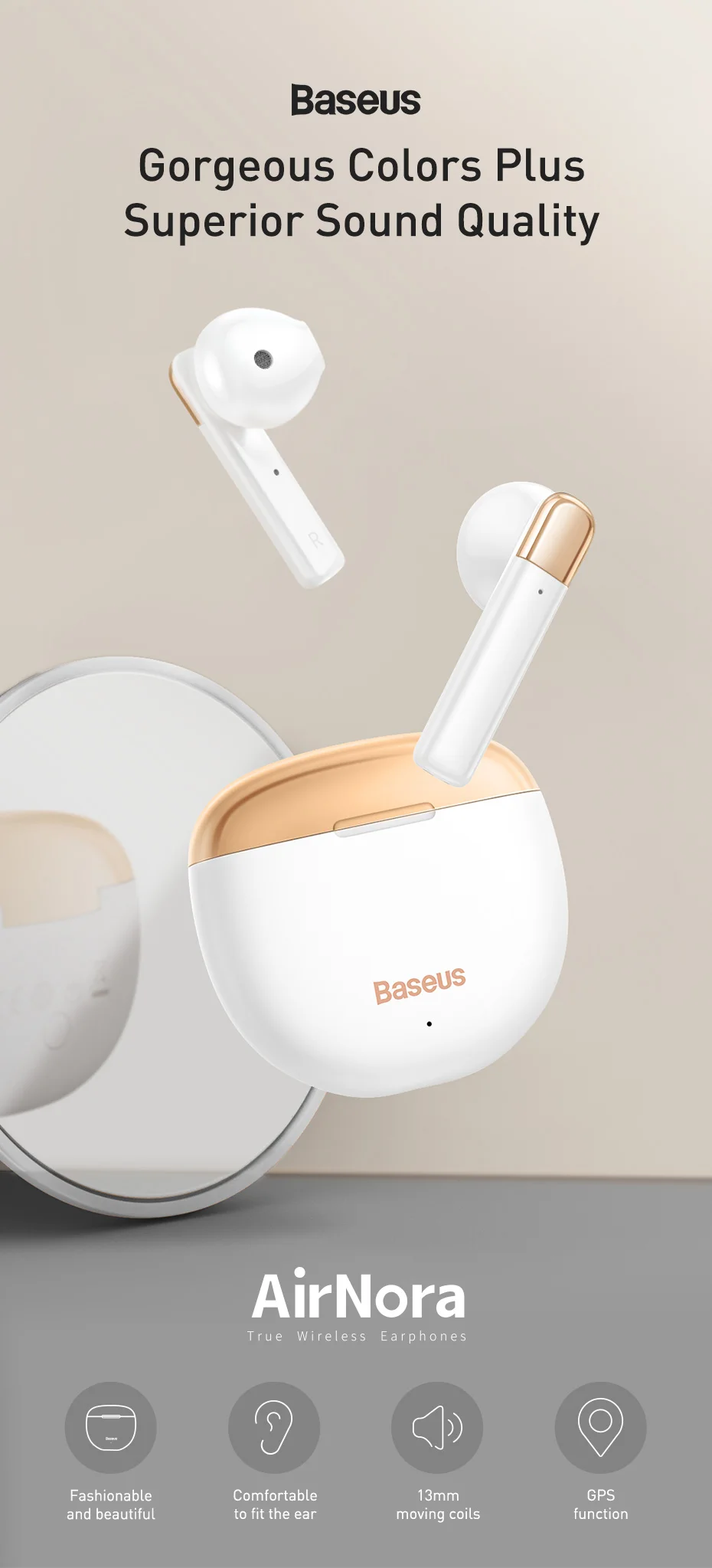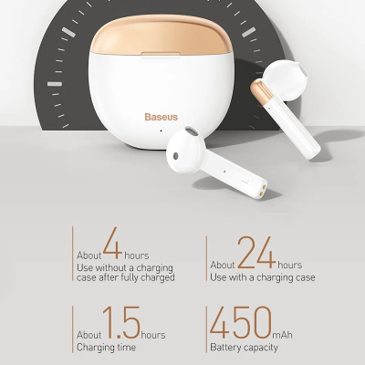 Each Baseus Air Nora earphone weights just 4g, lighter than a cotton pad, which is designed for women with small ear canals . The side in-ear design prevents stuffiness and ear pain . The ultra small size makes them more exquisite and easy tocarry . Unforgettable Sound Quality