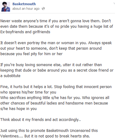 January 30, 2014 - Nigerian Comedian Basketmouth Gives 2014 Valentine's Day Advice . It seems Nigerian comedian Bright Okpocha popularly called Basketmouth can't for this year's valentine's day to come . He took to his Facebook page recently to admonish fans on love, heartbreak, dating , etc .