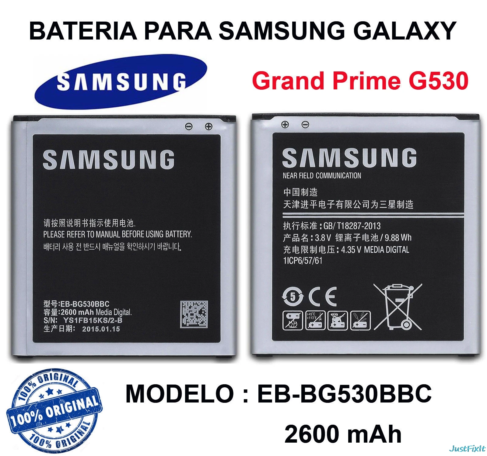 Батарея Samsung Galaxy Grand Prime G530H | J2 Prime G532F | J5 J500H | J3 (2016) J320F выходное напряжение (V): 3 .8 емкость (mAh): 2600 емкость (Wh): 9 .88