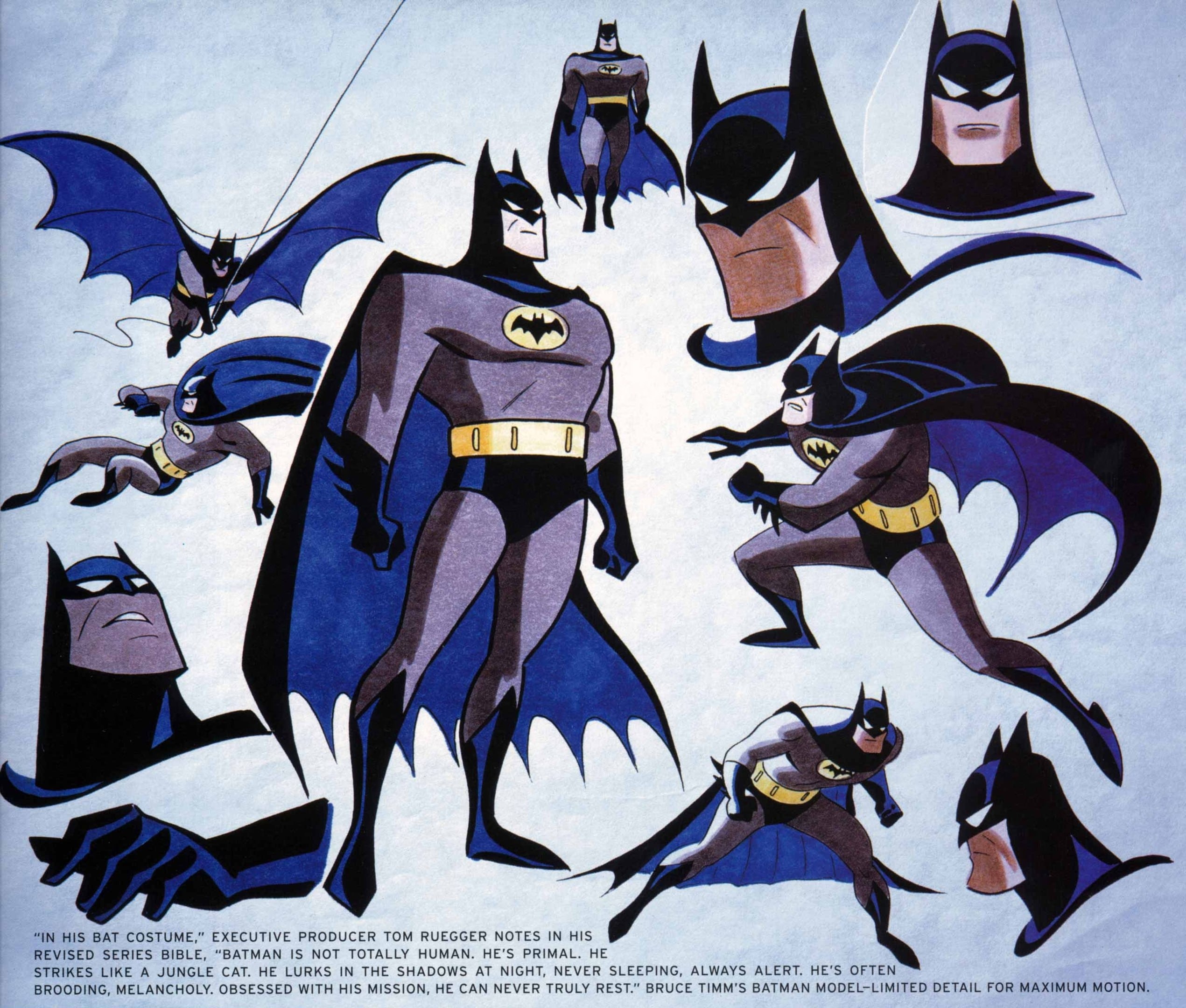 В наших намерениях было всегда показывать Бэтмена, через диалоги и действия, мрачным мстителем Готэм-Сити. Появляясь только по ночам, он использует свои отточенные детективные навыки, хитроумные гаджеты и пугающий образ в борьбе с преступниками Готэма. Он разговаривает только короткими, отрывистыми фразами, голосом, наводящим жуть и на добрых, и на нечестивых людей.