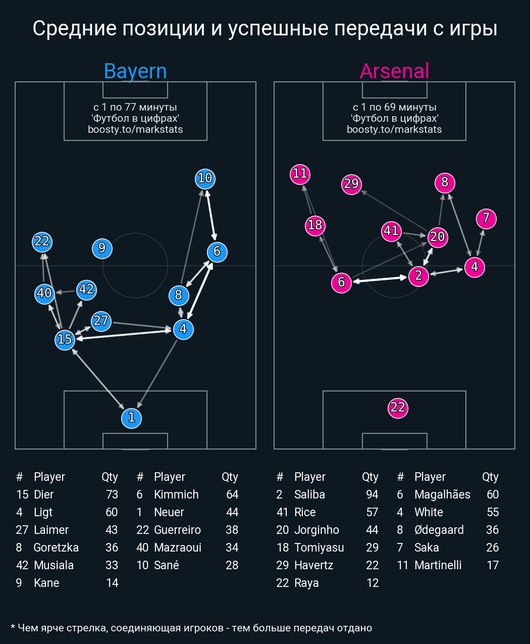 71 успешных передач из 76 попыток (5 с продвижением, 1 на трети соперника)