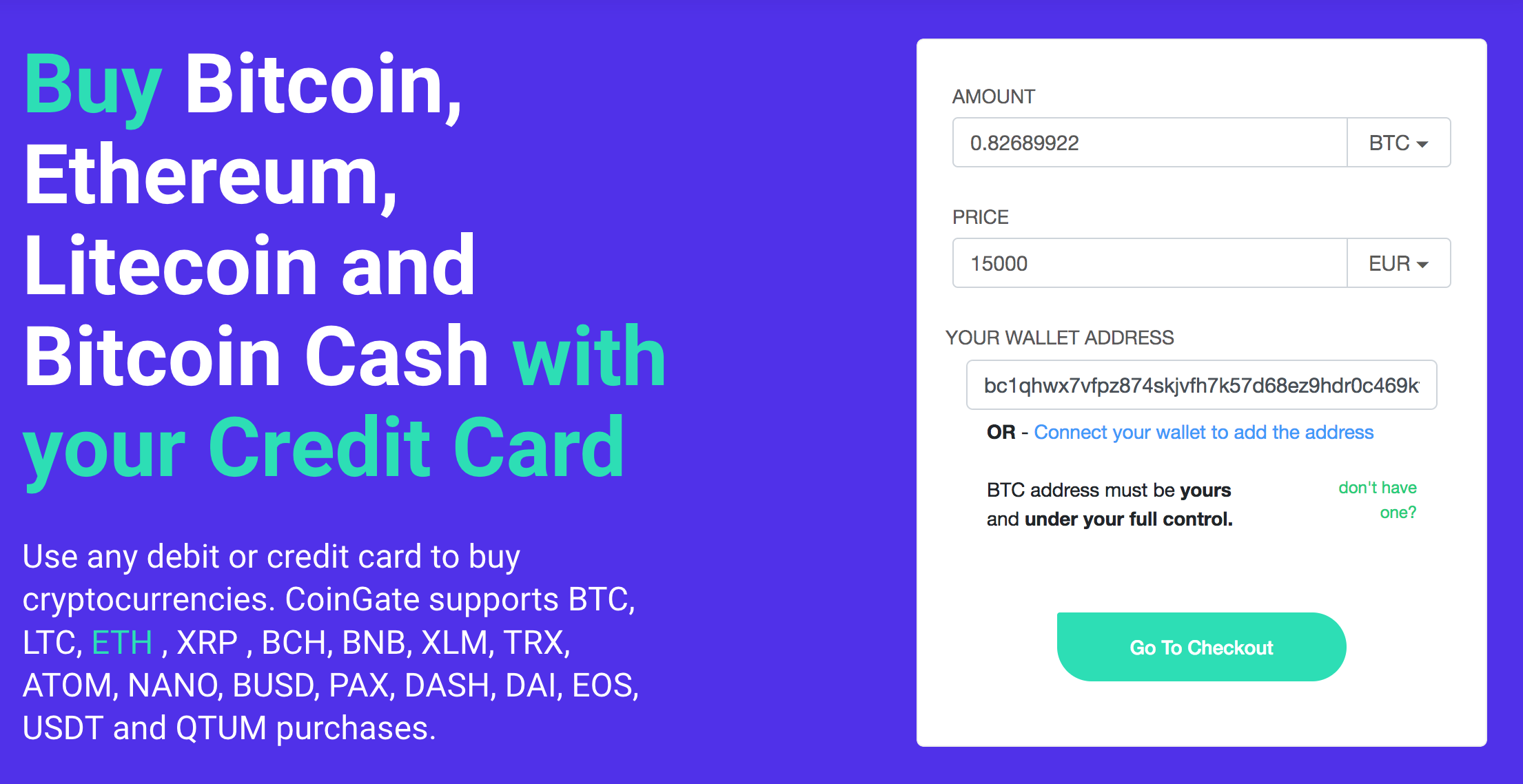There’s another way to deposit with Fiat funds if you don’t have a BTC wallet yet: crypto exchanges. Let's take Coingate as an example, it’s a well-known exchange for trading cryptocurrencies. There you can buy Bitcoin with a credit or debit card and then top up your balance with it.