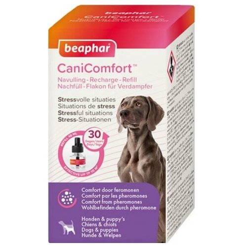 La phéromone utilisée dans Beaphar CaniComfort est une solution cliniquement prouvée, simple et efficace pour prévenir le stress et réduire les comportements indésirables du chien. L'utilisation de phéromones qui peuvent être détectées par le chien aide celui-ci à se sentir plus calme et plus confiant et réduit les problèmes associés à des comportements indésirables tels que les aboiements, l'endommagement des meubles, le marquage d'urine, le léchage et le grattage excessifs, la dissimulation ou l'anxiété générale. Beaphar CaniComfort est utile lorsque les chiens sont confrontés à de nouvelles expériences telles qu'un entraînement, un environnement inconnu, une nouvelle maison, un nouveau membre de la famille ou d'autres situations stressantes telles que des orages, des feux d'artifice et des bruits forts. La phéromone d'apaisement canine (DAP) est produite naturellement par une mère qui allaite et aide les chiots à naviguer et à reconnaître les zones sûres de l'environnement. Beaphar CaniComfort utilise une version synthétique de la phéromone d'apaisement canine pour donner aux chiens un sentiment de sécurité. Beaphar CaniComfort convient aux chiens de toutes races et de tous âges, n'affecte pas les autres animaux et n'a pas d'effet sédatif sur le chien. Contient une recharge (48 ml). Le diffuseur est acheté séparément. Conseils d'utilisation : Le diffuseur Beaphar CaniComfort doit être utilisé dans une pièce où votre chien effectue ses activités quotidiennes ; la plupart du temps. Surface d'action : 70 m2. Dévissez le capuchon du bloc. Insérez l'appareil dans le diffuseur et serrez jusqu'à ressentir une légère résistance. Branchez le diffuseur assemblé sur une prise électrique (n'utilisez pas de rallonges ni d'adaptateurs). Utiliser en continu sans éteindre. Une recharge (48 ml) suffit pour 30 jours. Après 30 jours d'utilisation, remplacez la recharge par une nouvelle recharge Beaphar CaniComfort. Avertissement : Avaler ou inhaler du liquide peut être mortel. Ne faites pas vomir, appelez un médecin et recherchez l'étiquette du produit. Un contact cutané répété avec le liquide de blocage peut provoquer une peau sèche et gercée. Stockage : Conserver le produit dans l'emballage du fabricant bien fermé dans un endroit sec, à l'abri de la lumière directe du soleil, hors de portée des enfants, séparément des denrées alimentaires et des aliments pour animaux, à une température ne dépassant pas 25 degrés ; C. N'utilisez pas le produit avec un diffuseur rechargeable après la date de péremption.