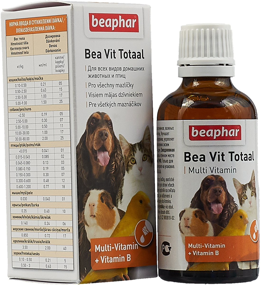 Беафар Комплекс витаминов группы В для собак, кошек, грызунов и птиц (Beaphar Vitamin-B-Complex 12523), фл . 50 мл Беафар Комплекс витаминов для всех домашних животных (Beaphar Vit Total 12620), фл . 50 мл