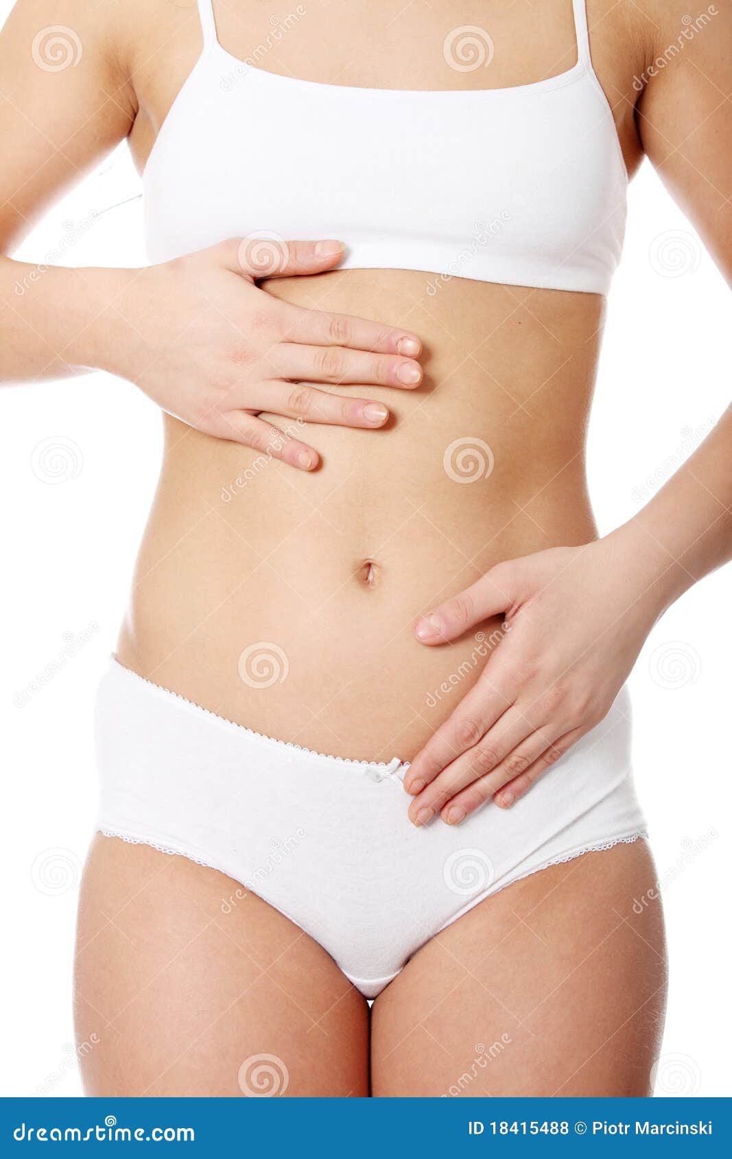 Female cropped fit body in white underwear, isolated on white. Female cropped fit body in white underwear, isolated on white, woman holds her top and shows her