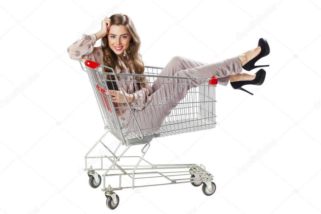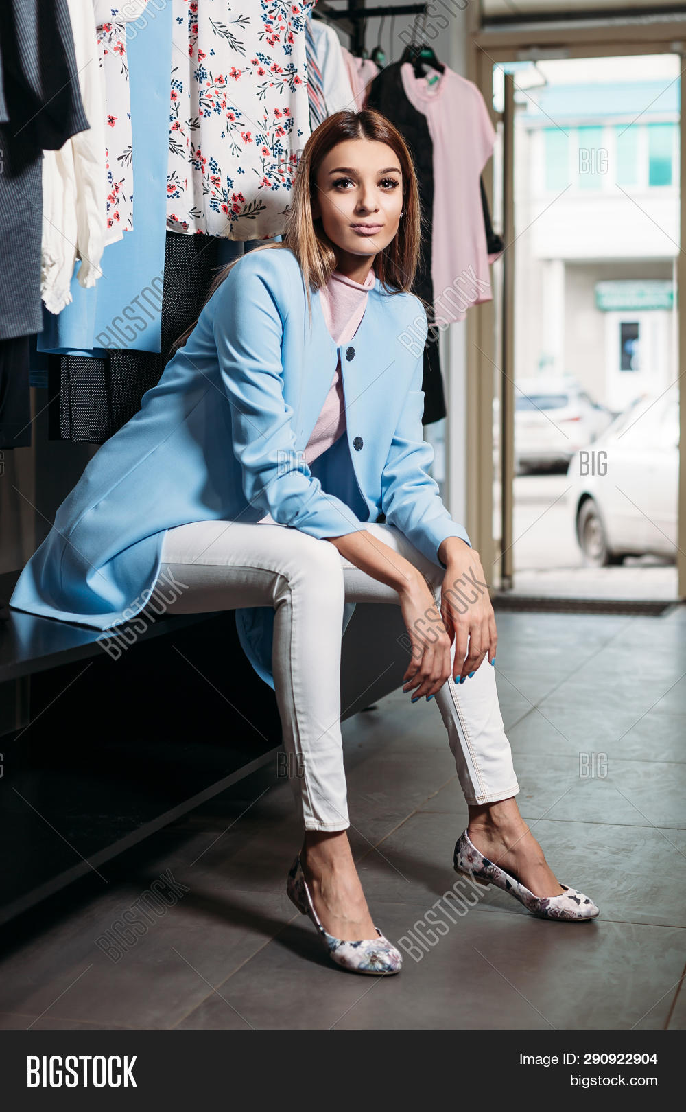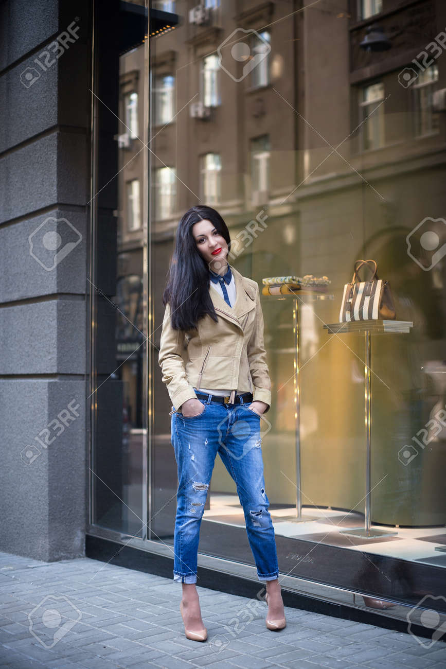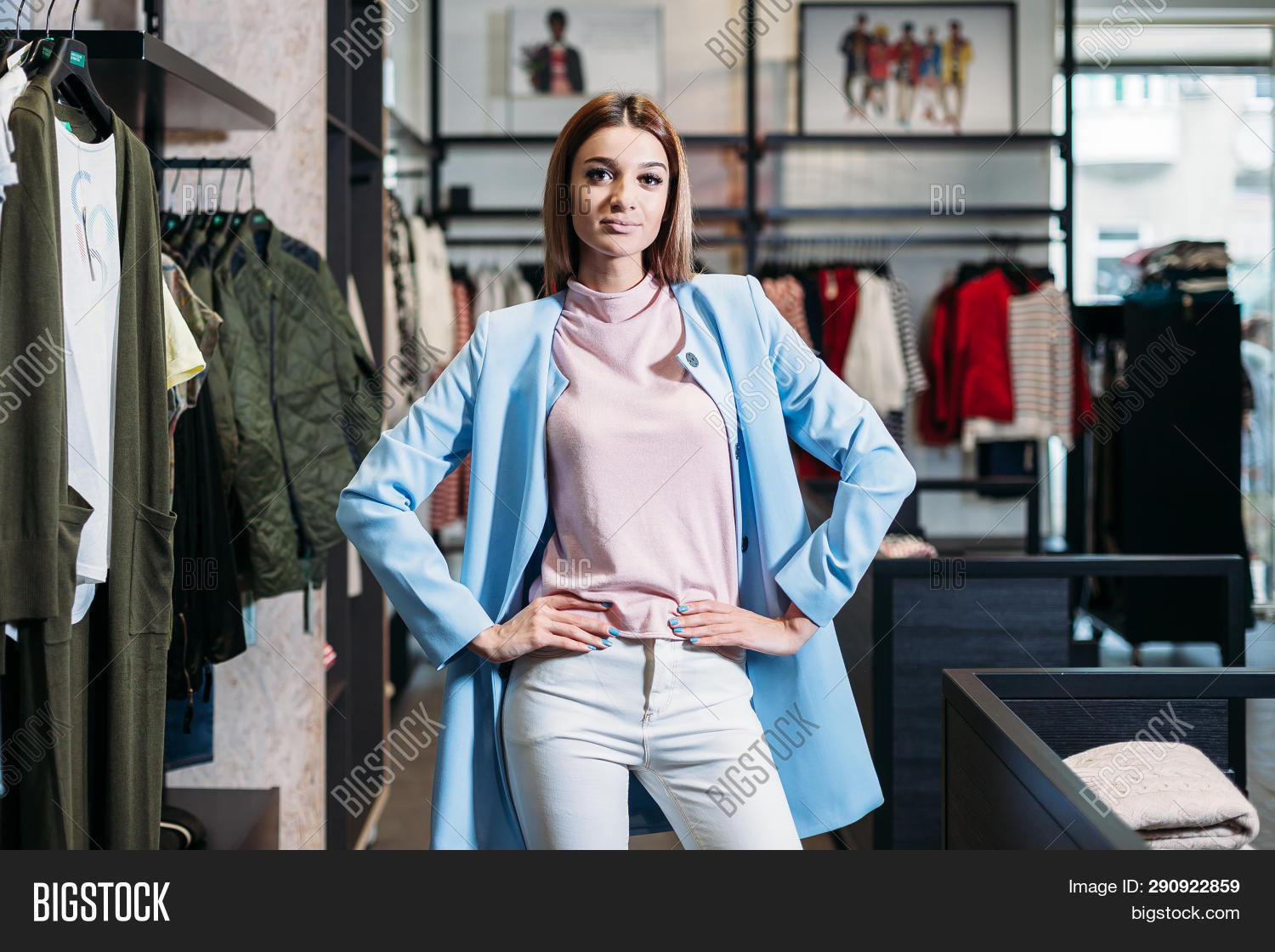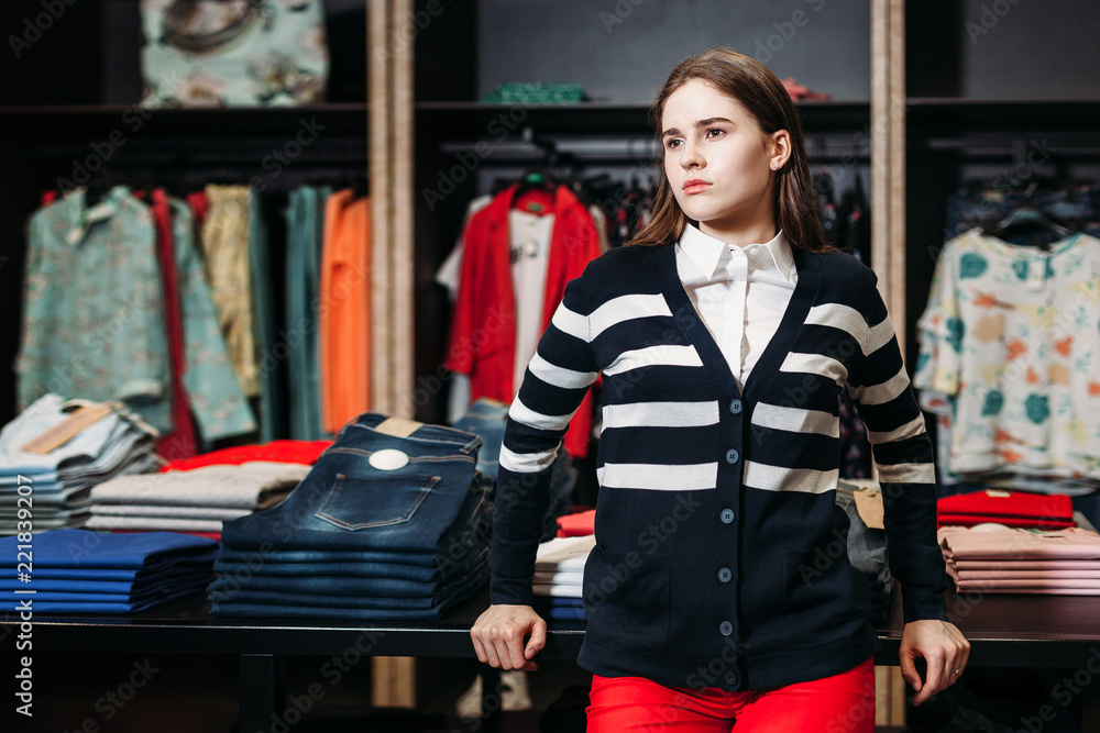 Beautiful brunette babe is posing in a shop