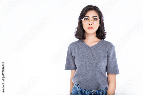 Beautiful Asian woman wearing glasses cheerful with a smile of face pointing with hand and finger up to the side with happy and . Natural expression on face Beautiful Asian woman wearing pink heart glasses with hand on chin thinking about question, pensive expression .