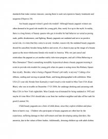 Beauty Pageants Essay . Topics: Beauty , Beauty contest , Woman Pages: 3 (561 words) Published: December 10, 2015 . Beauty pageants have been said to allow young girls in today's society to feel beautiful, and more self worthy as they get older . In reality, beauty pageants cause psychological issues formulated by the unrealistic norms set by . . .