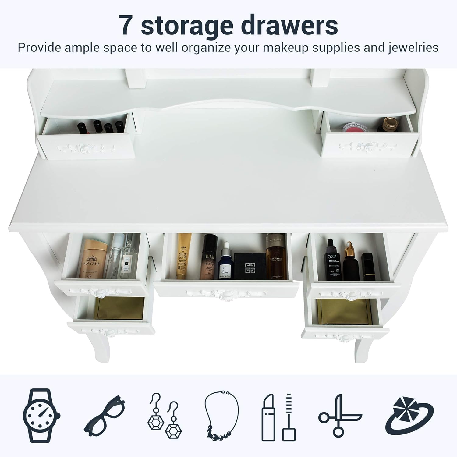 5-Drawers White Makeup Vanity Table Set with Stool Dressing Desk Vanity Wood with Round Mirror Storage Shelves . $11098 . /carton . Add To Cart . Compare . Exclusive .
