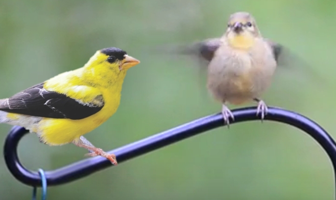 Baby cockatiel begging for food . Dad shows him how to eat . . .