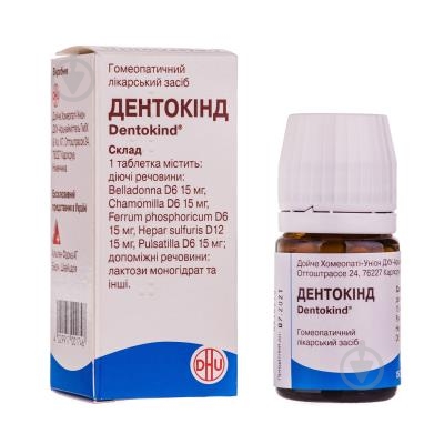 Дентокинд выпускается в форме гомеопатических таблеток для рассасывания . Таблетки плоскоцилиндрической формы, белого цвета, на поверхности имеется фаска . Выпускаются по 150 штук во флаконах темного стекла . Одна картонная пачка содержит 1 флакон . Действующими веществами в составе препарата являются следующие компоненты: Белладонна (Belladonna) D6;