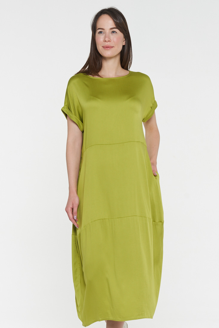 Платье-комбинация с подкладом из той же ткани. Платье А-силуэта на тонких бретелях. V-образный вырез. Выполнено из струящегося шелковистого материала. Длину бретелей можно регулировать, а свободный крой не стесняет движений при ходьбе. Хорошо сочетается с фактурными джемперами и жакетами.