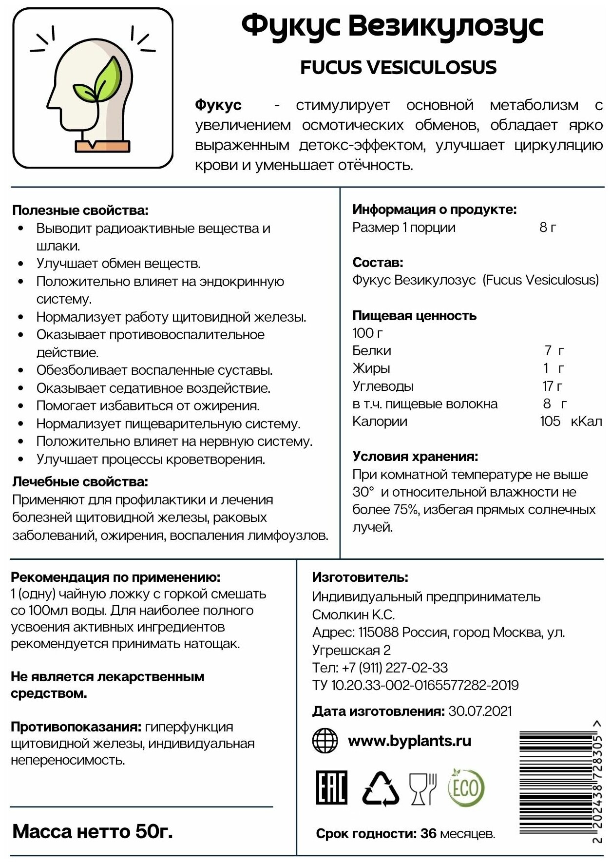 Состав фукус высушенный Пищевая ценность (100 гр .) белки - 6,7 гр ., жиры - 1,56 гр ., углеводы - 22 гр .; Энергетическая ценность 100 гр . (ккал .) 123 Масса нетто (гр .) 100 Упаковка бутылка (ПЭТ) . Срок хранения (мес .) 36 Условия хранения Хранить в чистом, сухом, хорошо проветриваемом помещении, не имеющем посторонних запахов . 176 руб . Подписаться