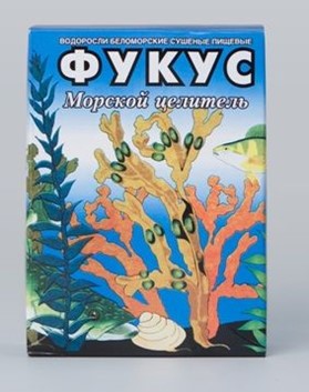 Активно действующее вещество - фукус беломорский (бурые водоросли) . Способ приготовления и применения сушеных пищевых водорослей Фукус (беломорский): Рекомендовано ежедневное употребление одной чайной ложки препарата водоросли сушеные пищевые Фукус (беломорский) до трёх раз в день во время принятия пищи .