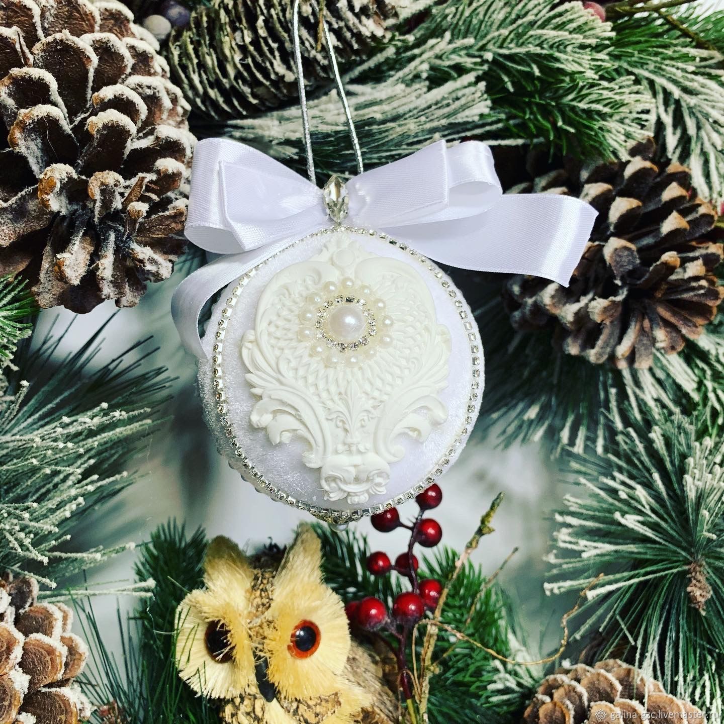 Красивые фото, картинки, обои, . . . Жемчужно белые елочные шары на ветке из дождика . Гирлянда, снежинка, свеча . . . . Обои новогодние шары на елке на фоне камина .
