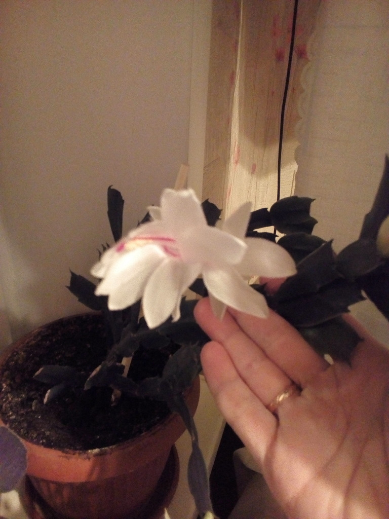 На фото: Цветущий декабрист . . . . Раскрылся первый белый бутон (всего их 9 . Цветок маленький еще года нет) . Рядом розовый, всего 3 бутона . В мае будет год . Я только начала заниматься декабристами .